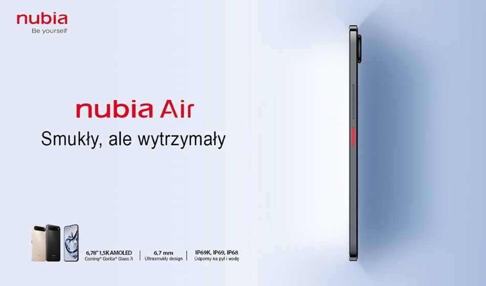 Nubia Air to ultrasmukły smartfon z 6,78-calowym wyświetlaczem AMOLED 1,5K, wydajną baterią 5000 mAh, wzmocnioną konstrukcją z certyfikatami IP68, IP69 i IP69K oraz 3-letnią gwarancją. To urządzenie, w którym lekka i smukła forma spotyka się z imponującą wytrzymałością i dużą baterią. Na start sprzedaży w Polsce marka przygotowała promocje – niższą o 100 zł cenę oraz dodatkowe 100 zł w formie bonu do wykorzystania w wybranych sklepach.