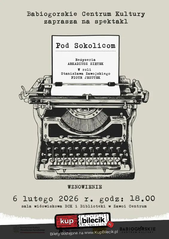 bilety: Z ogromną energią i radością informujemy o wznowieniu spektaklu Pod Sokolicom - kolejnej teatralnej odsłony związanej z twórczością Stanisława Bourdelle-Zawojskiego wyprodukowanej przez babiogórskie Centrum Kultury. Poemat "Pod Sokolicom" na podstawie którego powstał scenariusz, pełen jest zaklętych opowieści o przeszłości naszej babiogórskiej ziemi. Spektakl swoją premierę miał w czasie 41. Babiogórskiej Jesieni i spotkał się z niezwykle ciepłym odbiorem. Za reżyserię odpowiadał niezastąpiony Arkadiusz Ziętek. Już 6 lutego o godzinie 18tej zapraszamy Was na kolejne spotkanie z historiami, które przeniosą do dawnej Zawoi. Bilety do nabycia na: KupBilecik.plPod Sokolicom artyści: Teatr LudowyPoemat "Pod Sokolicom" na podstawie którego powstał scenariusz, pełen jest zaklętych opowieści o przeszłości babiogórskiej ziemi. Spektakl swoją premierę miał w czasie 41. Babiogórskiej Jesieni i spotkał się z niezwykle ciepłym odbiorem. Bilety do nabycia na: KupBilecik.pl |